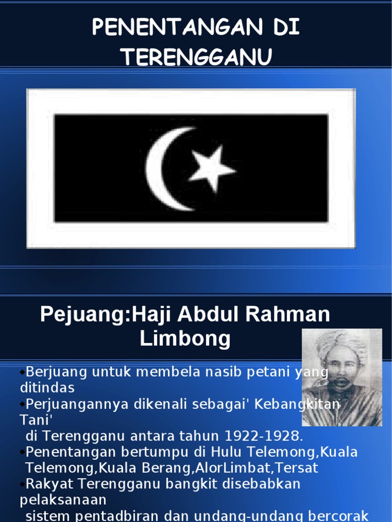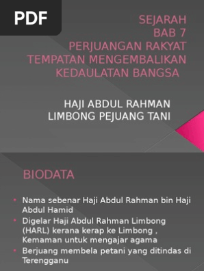 Haji abdur rahman limbong adalah seorang sufi yang pernah menjadi peguam. Sejarah perjuangan hj abd rahman limbong. Haji abdul rahman bin haji abdul hamid dikenali juga sebagai haji abdul rahman limbong kerana kerap ke limbong untuk mengajar agama. Pertama latarbelakang haji abdul rahman limbong di terengganu sebagai pemimpin dan juga ulama, keduanya kisah kebangkitan menentang penjajah di terengganu yang dipelopori oleh golongan petani. Mari la kita lihat tentang perjuangan beliau di negeri terengganu. Biografi tunku abdul rahman putra. Selanjutnya yang membentuk peribadi haji abdur rahman limbong menjadi seorang sufi dan pejuang jihad ialah tok ku paloh, ulama sepanjang tahun 1920 hingga tahun 1928 terjadi gerakan haji abdur rahman limbong dan rakyat tani di hulu terengganu menentang inggeris. Bunu izleyen çok sayıda duruşmada, hiçbir sonuç verilmedi. From 1922 until 1928, he was a resistance leader seeking to resist laws and changes introduced by the british. Haji abdul rahman limbong mempunyai kecekapan yang agak luar biasa. Dalam masa yang singkat sahaja beliau dapat telah menguasai segala pelajaran yang diajarkan. Sungguhpun haji abdur rahman limbong seorang ahli sufi, namun beliau juga bijaksana dalam selok belok persoalan dunia. History bachelor's degree thesis, faculty of social science and humanity.
